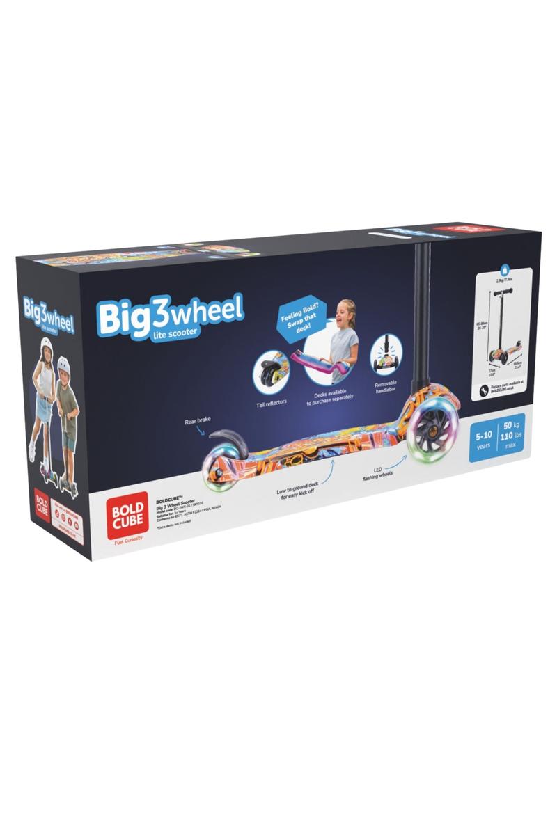 The BOLDCUBE Big 3 Wheel Scooter – Street Graffiti delivers eye-catching style paired with smooth, stable performance kids love. Designed for confident cruising and everyday outdoor play, this scooter combines a vibrant colorway with durable construction and thoughtful features that support balance, coordination, and fun on the move.
