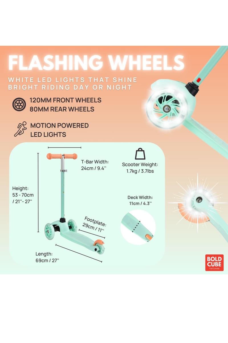 The BOLDCUBE Teeny 3 Wheel Scooter is designed as a starter scooter for younger riders who are just getting comfortable with movement, balance, and coordination. Its three-wheel, self-balancing design offers added stability, while the lightweight frame makes it easy to maneuver both at home and outdoors. With a clean, modern look and soft pastel colorways, Teeny scooters are built to grow confidence while encouraging active play.