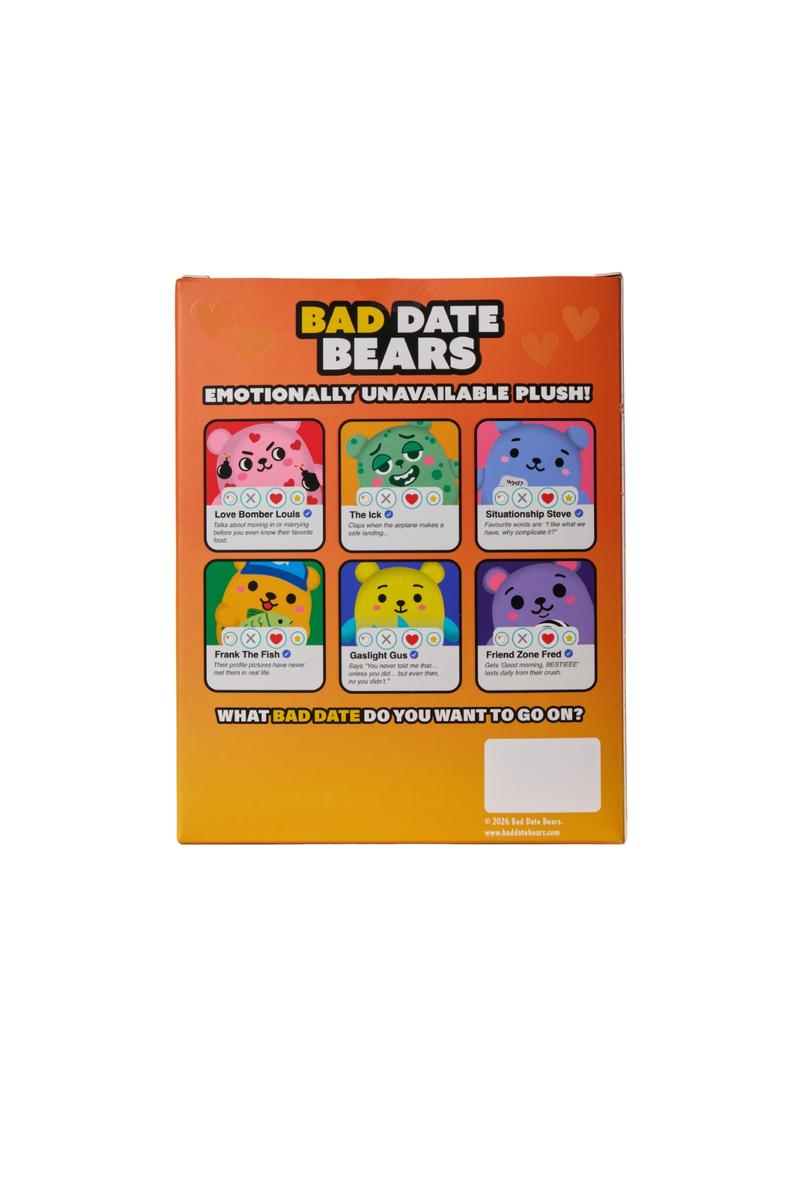 Bad Date Bears™ are back—and this time, the red flags are 7 inches tall. Inspired by dating app culture and viral relationship chaos, each plush features a bold personality, swipe-style packaging, and a bio that spills all the tea. Soft on the outside, emotionally unavailable on the inside.