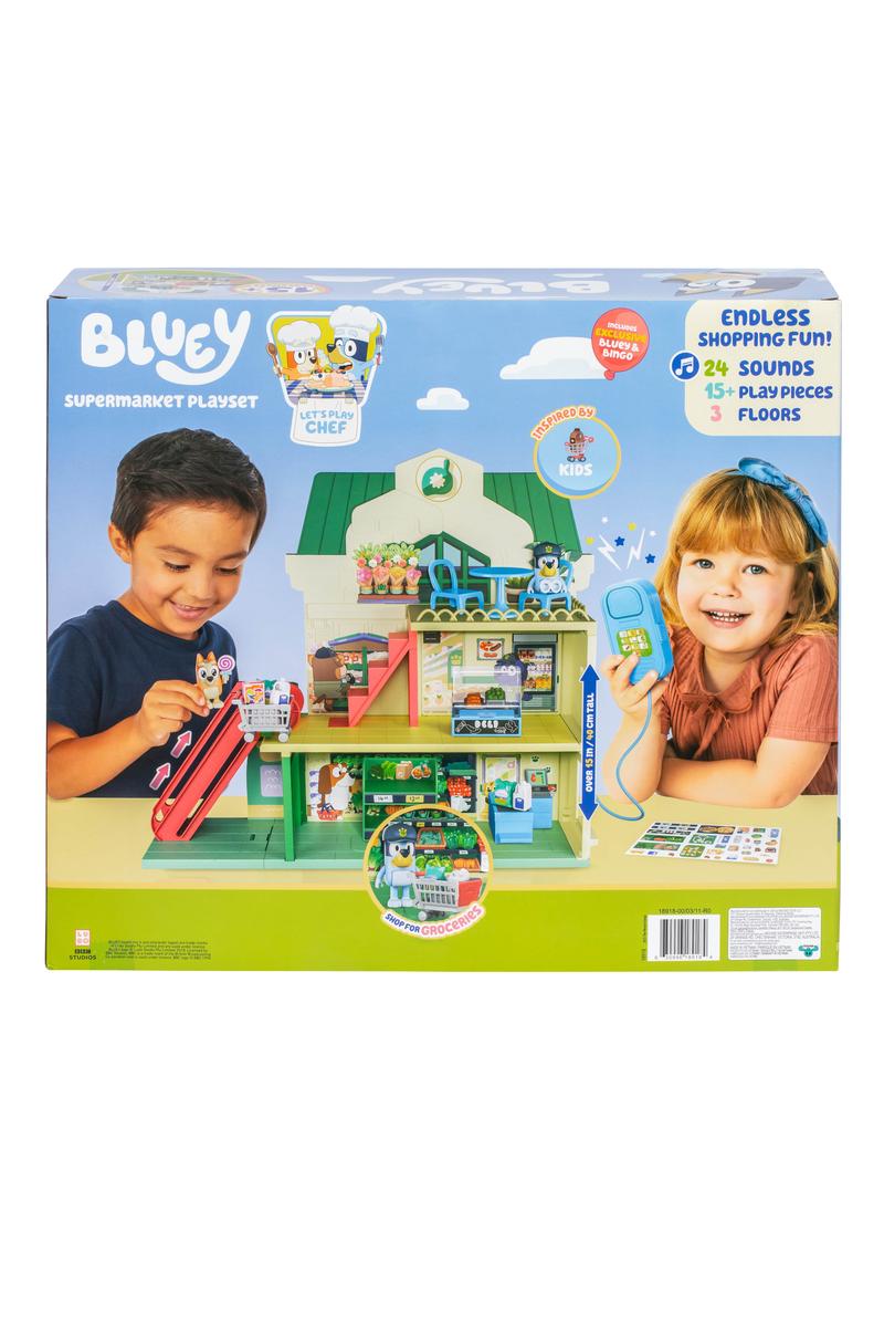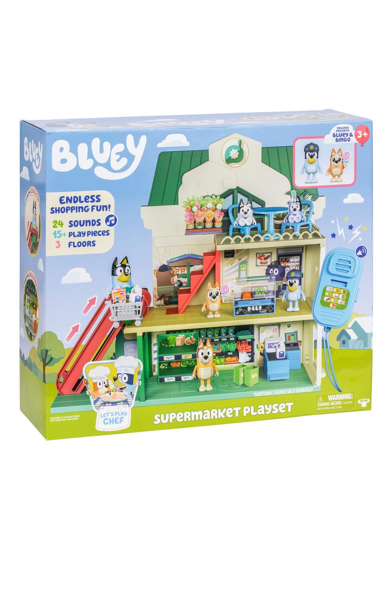 Bluey™ brings the joy of pretend play to life with the Series 13 Supermarket Playset! This exciting 3-story setup features over 15 play pieces, interactive sound effects, and fan-favorite figures Bluey and Bingo to get the shopping fun started.