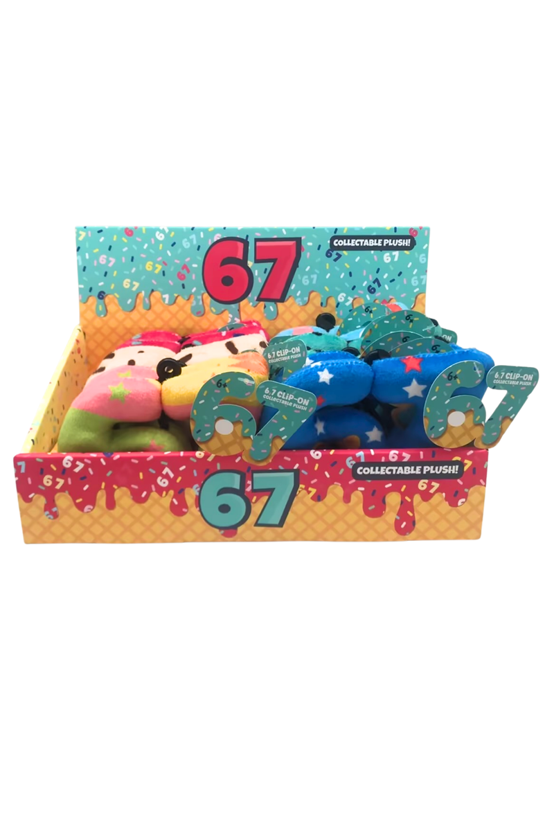 Kids say it. Adults hear it everywhere. The 6–7 Clip-On Plush Assortment brings the familiar number pairing into a soft, collectible format that’s playful, recognizable, and built for quick impulse moments. Designed with bold colors and fun, dessert-inspired patterns, these plush clips are easy to grab, easy to display, and easy to sell.