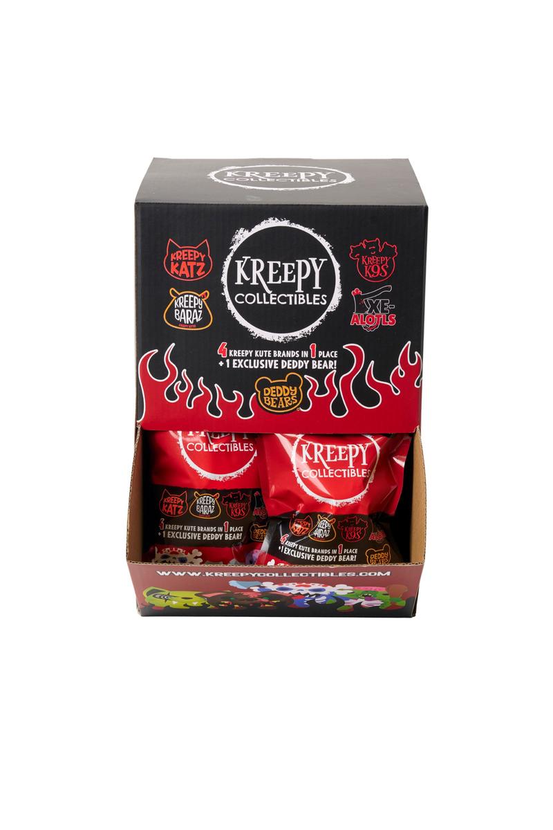 This Kreepy Collectibles Blind Bags display brings together a curated assortment of collectible characters across the Kreepy universe, designed to drive excitement and repeat pulls. Featuring an assorted brand mix from Deddy Bears, Kreepy Katz, Kreepy K9s, Kreepy Baraz, and Axe-Alotls, this display delivers strong visual variety, built-in collectibility, and mystery-driven impulse appeal in one easy, ready-to-merchandise format.