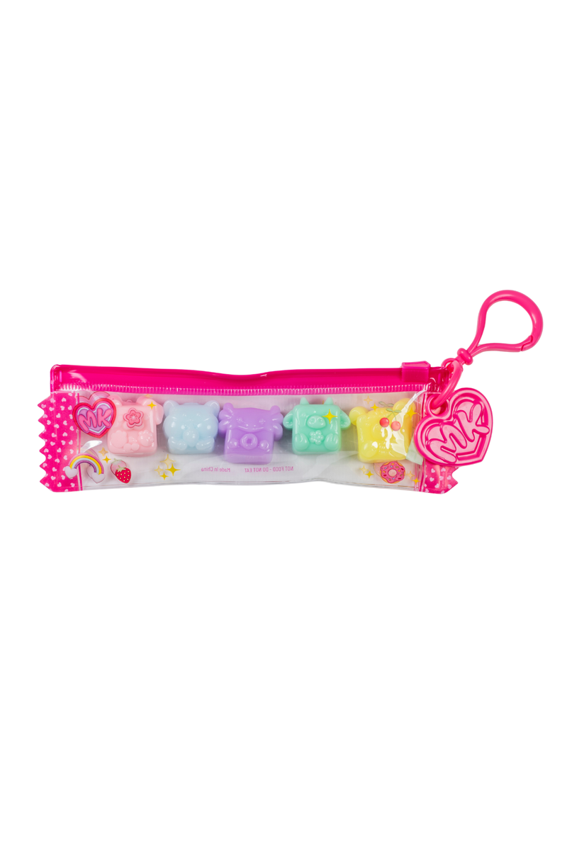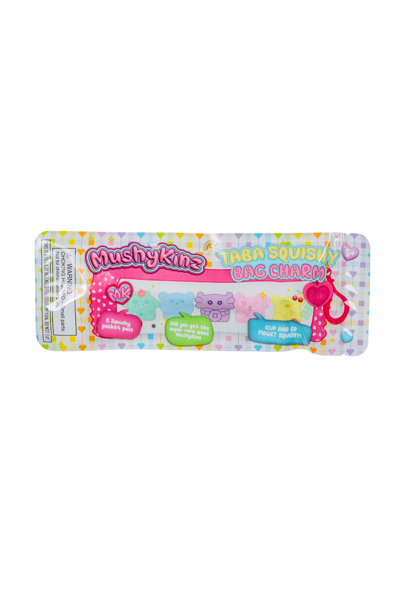 MushyKinz Taba Squishy Bag Charms turn the viral squishy trend into a take-anywhere collectible. Each set includes a lineup of soft, squeezable characters tucked inside a clear pouch, complete with a clip for easy attachment to backpacks, bags, or keys.